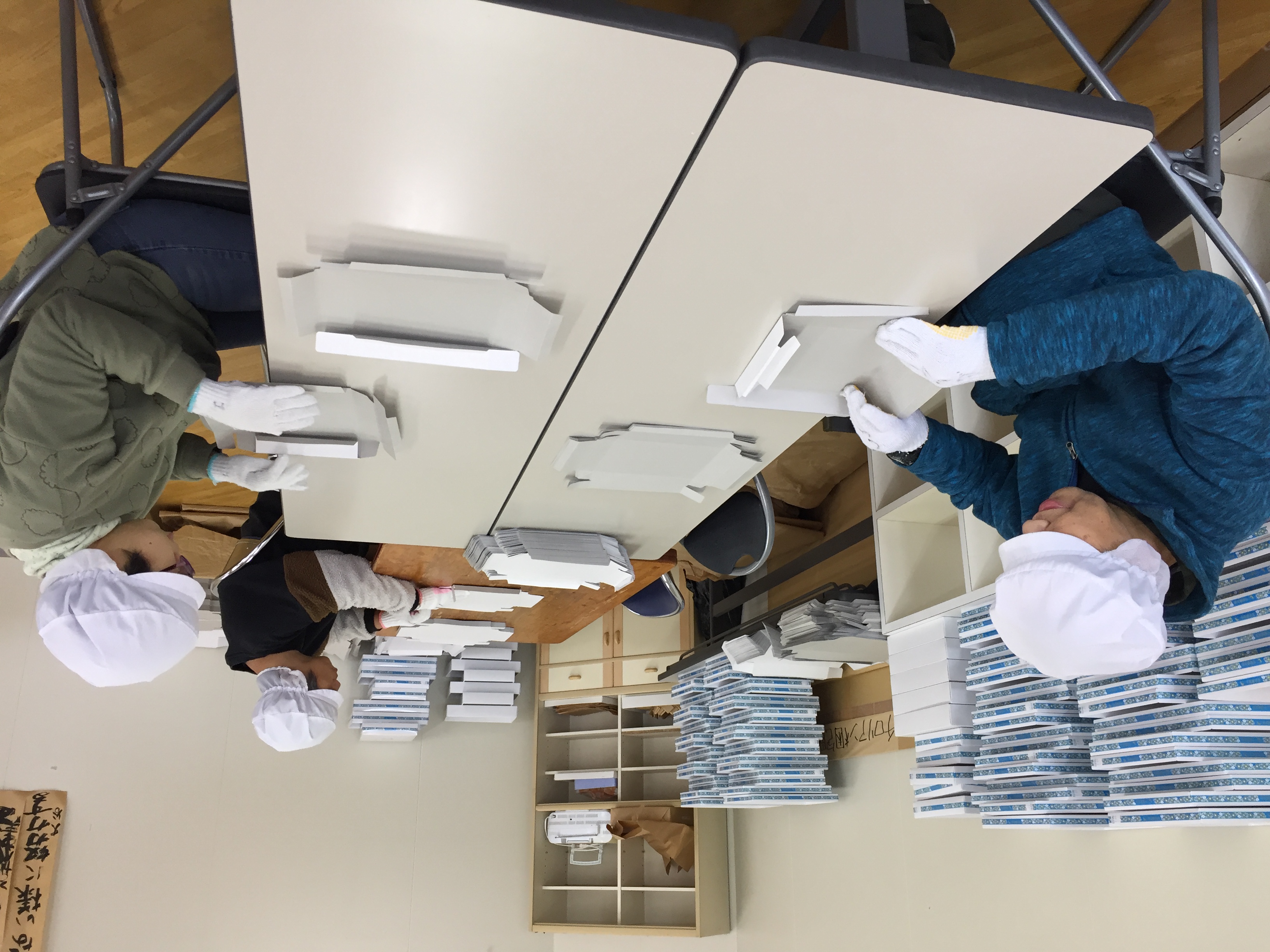 九州銘菓「ヨーデルン」の折箱作業を行っています。私たちが作ったものが流通して、おいしいお菓子の箱になっていることがうれしく思います。